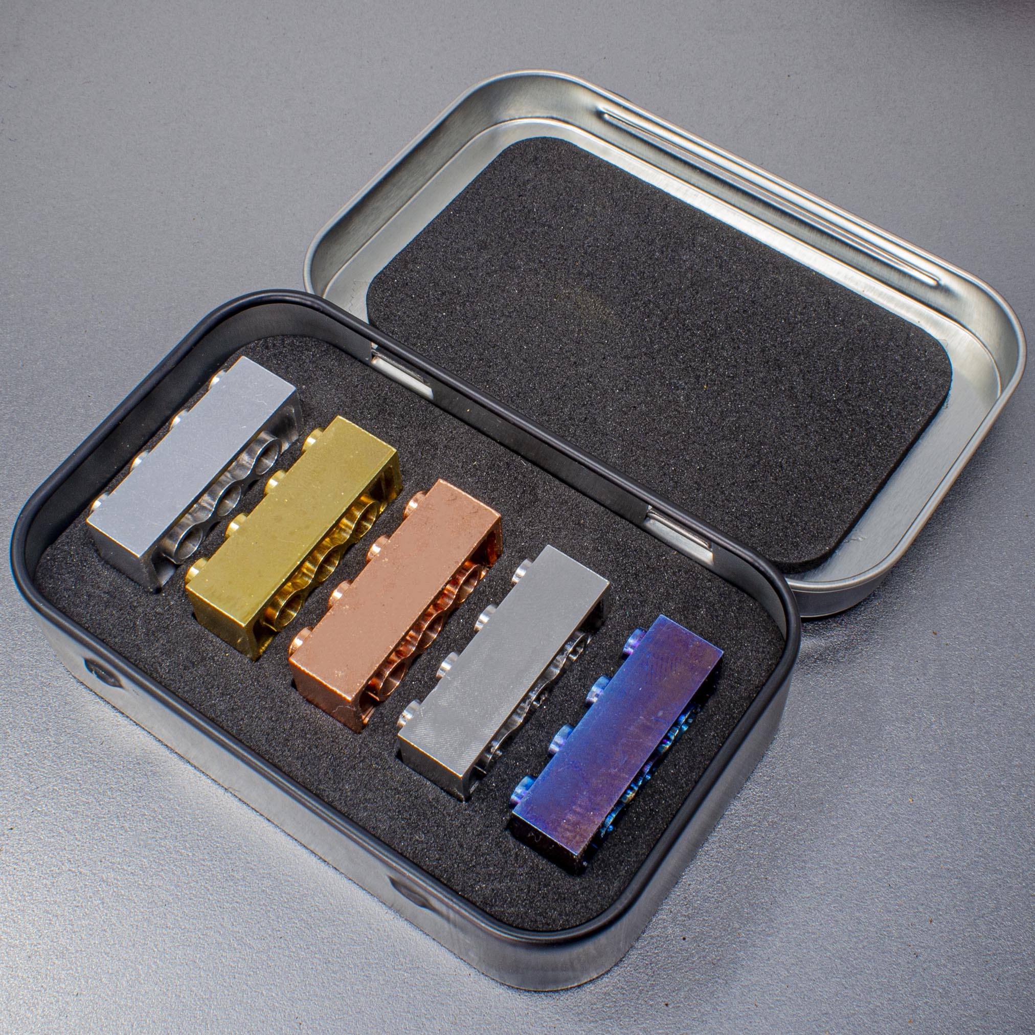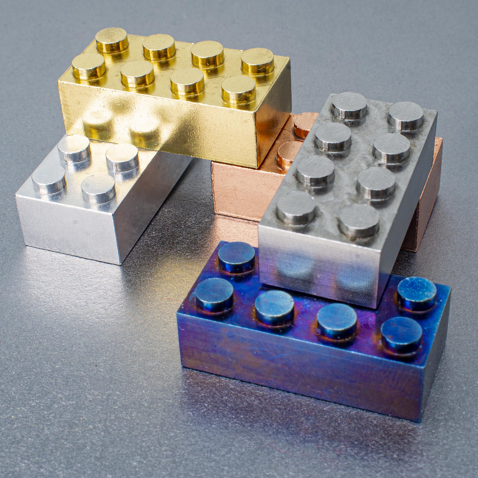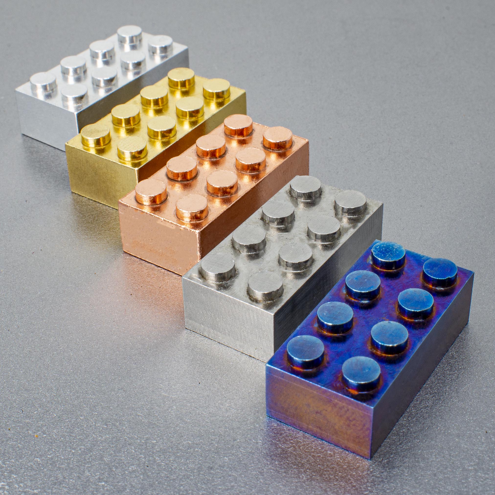 Mix and match up to 5 of our standard bricks to make the ultimate giftset from Aluminum, Brass, Copper, Steel, and Titanium. If you’d like more than 5 bricks in your gift set, no worries, they will just come in more than one gift box. These bricks are CNC machined from a solid billet and are sized to be compatible with industry standard bricks such as those made by LEGO®. These heat anodized titanium bricks are solid metal, giving them a heft not seen in standard bricks.